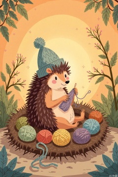Cartoon illustration,,A cozy, watercolor children's sketch of a hedgehog knitting a sock. The hedgehog has soft, brown spines and tiny, nimble paws, and is wearing a woolly hat. It sits in a nest of leaves and twigs, with yarn scattered around. The background is a soft orange, like the glow of a fireplace. The hedgehog has a concentrated expression, needles clicking rhythmically. The drawing exudes comfort and homeliness. The hedgehog's woolly hat has a subtle texture, adding warmth to the scene. The leaves and twigs in the nest have varying shades of green and brown, enhancing the natural and rustic feel. The yarn is in different colors, creating a vibrant yet harmonious palette. The soft lighting emphasizes the cozy atmosphere, making the scene feel warm and inviting.