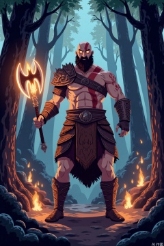 Cartoon illustration,,God of War, Kratos holds a glowing battle axe in his hands, determined and ready for a fight. He stands inside a dark forest in Asgard. Visual effects include fiery special effects that illuminate the scene. Dynamic action poses and cinematic film shots enhance the intensity. The image is highly detailed with ultra-high resolutions at 32K UHD, featuring sharp focus and best quality, creating a masterpiece.