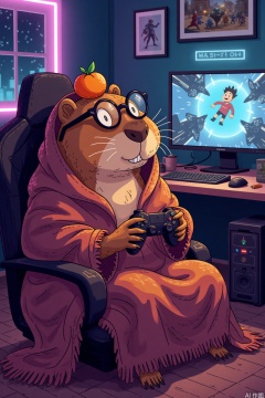 Cartoon illustration,,A detailed illustration of a capybara (1.2 meters tall) with an orange perched on its head, snugly wrapped in a cozy knitted blanket, wearing stylish round glasses, and gripping a gaming controller. The scene unfolds in a vibrant, modern room with a large computer screen displaying an immersive video game. The room is bathed in warm, ambient lighting, highlighting the textures of the blanket and the reflective surfaces of the glasses. The capybara's expression is one of focused enjoyment, surrounded by posters and gaming paraphernalia. The backdrop features an LED light strip, creating an atmosphere of a dedicated gaming setup. The lighting casts a soft glow, enhancing the room's cozy ambiance. The image is rendered in high definition with intricate details, showcasing the fine fibers of the blanket and the subtle reflections on the glasses.