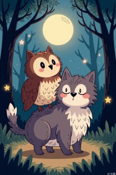 Cartoon illustration,Create a heartwarming image featuring an owl and a cat together. The owl perches on the cat's back, both looking curiously at the viewer. The cat has a gentle expression, and its fur is soft and fluffy, colored in shades of gray and white. The owl has large, expressive eyes and feathers that are detailed and textured, with hues of brown and white. They are set against a cozy, nighttime backdrop with a full moon shining in the background, casting a soft glow over the scene. The environment includes elements like tree branches and leaves, adding to the natural and serene setting.
