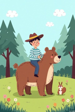 Cartoon illustration,A cartoon drawing of a boy riding a brown bear. The boy is wearing a blue striped shirt, blue pants, and a brown hat with a yellow stripe on it. The bear is standing on a grassy field with flowers scattered around it. To the right of the bear is a small squirrel with a white face and brown ears. Behind the bear and squirrel is a large tree with brown branches and leaves. In the background are tall green trees. The sky is blue with white clouds.