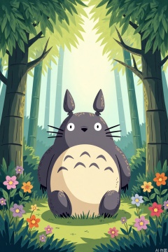 Cartoon illustration,Create a heartwarming and whimsical illustration featuring Totoro, the lovable forest spirit from Hayao Miyazaki's films. Totoro is sitting under a blossoming tree in a serene forest, surrounded by lush greenery and colorful wildflowers. His fur is soft and fluffy, with shades of gray blending seamlessly into his body. The sunlight filters through the leaves, casting dappled shadows on the ground. In the background, the silhouette of a bamboo forest can be seen, adding depth and texture to the scene. The overall composition is peaceful and enchanting, capturing the magic of nature and childhood wonder.