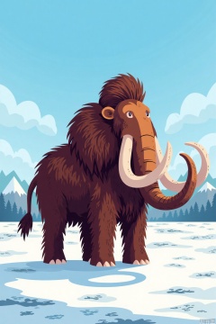 Cartoon illustration,A woolly mammoth stands proudly in a snowy landscape, its long fur flowing gently in the wind. The mammoth's fur is thick and detailed, showing individual strands and patches. The background features a vast icy plain with distant snow-capped mountains under a clear blue sky. The sunlight casts soft shadows and highlights on the mammoth’s fur, adding depth and realism to the scene. The composition is balanced, with the mammoth positioned slightly off-center, creating a dynamic and engaging image. The woolly mammoth is depicted in a realistic yet artistic style, emphasizing its majestic presence in a natural environment.