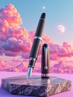Product Shots,A photograph of a sleek black fountain pen with a silver nib and a matching pen holder,placed on a gray stone pedestal against a vibrant,surreal backdrop of pink and purple clouds,and a glowing full moon. The scene evokes a dreamy,ethereal atmosphere.,