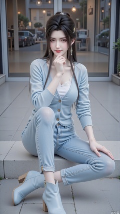 The color matching of the clothing is harmonious. The combination of light colors creates a fresh atmosphere. The match between the knitted cardigan and jeans is classic and daily - life. Details such as the flower - shaped buttons, lace - trimmed inner layer, short boots and socks echo each other, enhancing the overall fashion sense.