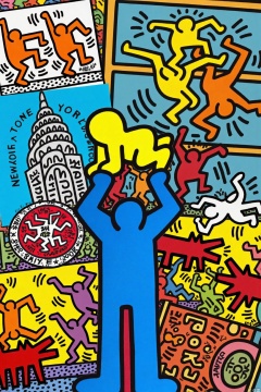 The image is a colorful, stylized illustration that combines various iconic elements of pop culture and urban life. It features a variety of vibrant colors, including blue, yellow, red, and orange, which are used to depict different scenes and characters. The central figure is a large blue humanoid character, seemingly supporting a smaller yellow character, which is standing on its shoulders. Surrounding them are smaller figures engaged in various activities, such as dancing, playing sports, and interacting with each other.
