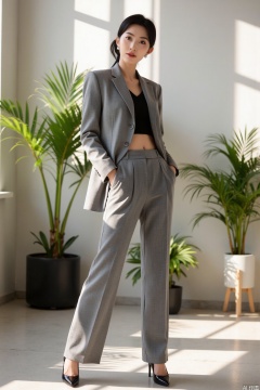 A stylish and modern female business elite in a gray suit paired with matching wide - leg pants and black high heels. Standing in a minimalist meeting room filled with green plants, the slanting sunlight creates an atmosphere where fashion and professionalism coexist.