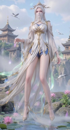 SFW,(masterpiece:1.2),best quality,1girl,solo,long hair,long dress,celestial maiden in flowing tulle gown levitates above lotus pond, ethereal mist trails from hair ribbons, mythical Penglai paradise emerges through clouds with glowing pavilions, translucent bioluminescent lotus blooms, flock of cranes gliding over water surface, ultra HD with soft 3D rendering, morning light filters through mist, falling petal rain, intricate details on scale-patterned fabric and lotus veins.(huge breasts:2.99),(full breasts:2.99),XanmiaoyiY,XhuolingerHHY,XwangqiuerKQW,Xxuenv,Xnanqiuqiu,Xhuangnv,XchuxuanerX,XchuxuanerXY