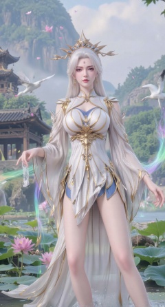 SFW,(masterpiece:1.2),best quality,1girl,solo,long hair,long dress,celestial maiden in flowing tulle gown levitates above lotus pond, ethereal mist trails from hair ribbons, mythical Penglai paradise emerges through clouds with glowing pavilions, translucent bioluminescent lotus blooms, flock of cranes gliding over water surface, ultra HD with soft 3D rendering, morning light filters through mist, falling petal rain, intricate details on scale-patterned fabric and lotus veins.(huge breasts:2.99),(full breasts:2.99),XanmiaoyiY,XhuolingerHHY,XwangqiuerKQW,Xxuenv,Xnanqiuqiu,Xhuangnv,XchuxuanerX,XchuxuanerXY