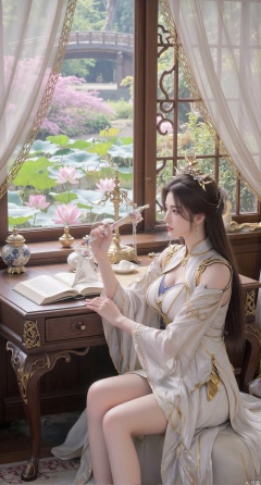 SFW,(masterpiece, best quality:1.2),1girl, solo, long dress,Ancient princess's boudoir with bright color palette,,(huge breasts:2.39),(full breasts:2.39), Hanfu-clad maiden sitting by latticed window desk in romantic daydreaming posture, classical Chinese garden through window showcasing lotus pond filled with blooming pink and white lotuses, delicate ink-wash painting style, interior featuring rosewood furniture with mother-of-pearl inlay, silk curtains fluttering in breeze, porcelain stationery set on desk, distant view of curved bridges and pavilions in garden, ultra HD rendering with crisp details on embroidered garments and translucent lotus petals,,(huge breasts:2.99),(full breasts:2.99),,XtianqiongY,XliumeiY,XyueliuY,Xxiaowu,Xyusanniang,Xxuenv,XchuxuanerXY,XchuxuanerX,Xhuangnv,Xshangguanweier