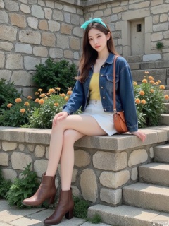A young Asian woman sits casually on a weathered stone wall, her relaxed pose radiating a sense of calm and contentment. She has long, flowing hair that dances lightly in the breeze, secured with a vibrant turquoise headband. She wears a loose-fitting blue denim jacket over a bright yellow top, which adds a pop of color against her pale skin. The outfit is completed with a white mini skirt that contrasts softly with her well-worn brown ankle boots, giving off a playful yet edgy vibe. A small crossbody bag hangs at her side, colored in a rich orange that complements her overall look and suggests a carefree spirit. The setting is a serene outdoor space adorned with ancient stone walls, hinting at the remnants of a rustic village or an old town. The stonework exhibits a variety of hues ranging from pale beige to light gray, accentuated by earthy tones of moss and small patches of grass peeking through the cracks. This setting showcases a timeless charm and an inviting rustic feel. The light is soft and diffused, perhaps indicative of a late afternoon, casting gentle shadows that add depth to the scene. Sunlight filters through, creating an intimate atmosphere while enhancing the colors of the flowers nearby—subtle pops of orange and green accent the composition, adding vibrancy and life. In terms of color palettes, the scene is characterized by harmonious earthy tones—soft grays and browns of the stone, vibrant blues of her clothing, contrasted by warm yellows and oranges of the flowers. This palette elicits a feeling of warmth and tranquility, inviting the viewer to linger. The composition effectively leads the eye from the foreground, where her feet dangle, to her seated figure in the middle ground, and finally to the rustic stone wall in the background, creating layers that draw the viewer into this inviting scene. The overall mood is relaxed and nostalgic, reminiscent of carefree summer days, inspiring a sense of freedom and youthful exuberance.