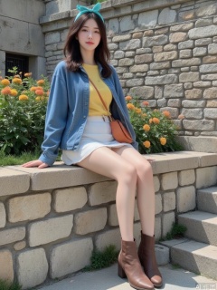 A young Asian woman sits casually on a weathered stone wall, her relaxed pose radiating a sense of calm and contentment. She has long, flowing hair that dances lightly in the breeze, secured with a vibrant turquoise headband. She wears a loose-fitting blue denim jacket over a bright yellow top, which adds a pop of color against her pale skin. The outfit is completed with a white mini skirt that contrasts softly with her well-worn brown ankle boots, giving off a playful yet edgy vibe. A small crossbody bag hangs at her side, colored in a rich orange that complements her overall look and suggests a carefree spirit. The setting is a serene outdoor space adorned with ancient stone walls, hinting at the remnants of a rustic village or an old town. The stonework exhibits a variety of hues ranging from pale beige to light gray, accentuated by earthy tones of moss and small patches of grass peeking through the cracks. This setting showcases a timeless charm and an inviting rustic feel. The light is soft and diffused, perhaps indicative of a late afternoon, casting gentle shadows that add depth to the scene. Sunlight filters through, creating an intimate atmosphere while enhancing the colors of the flowers nearby—subtle pops of orange and green accent the composition, adding vibrancy and life. In terms of color palettes, the scene is characterized by harmonious earthy tones—soft grays and browns of the stone, vibrant blues of her clothing, contrasted by warm yellows and oranges of the flowers. This palette elicits a feeling of warmth and tranquility, inviting the viewer to linger. The composition effectively leads the eye from the foreground, where her feet dangle, to her seated figure in the middle ground, and finally to the rustic stone wall in the background, creating layers that draw the viewer into this inviting scene. The overall mood is relaxed and nostalgic, reminiscent of carefree summer days, inspiring a sense of freedom and youthful exuberance.