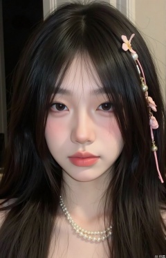 1girl, solo, long hair, looking at viewer, black hair, hair ornament, jewelry, closed mouth, necklace, black eyes, lips, portrait, realistic, pearl necklace