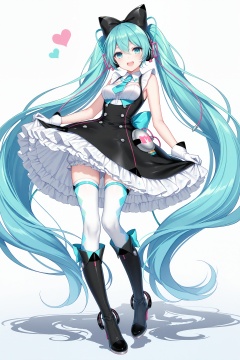 masterpiece,best quality,newest,absurdres,highres,soft shadows,photorealistic,(bison cangshu:0.5),(hiten \(hitenkei\):0.4),(rimuu:0.5),(mignon:0.5),(sheya:0.6),<lora:MMM2016XLNAI:1>,magical mirai miku \(2016\),black bow,hair bow,sleeveless dress,frilled dress,black dress,layered dress,pocket,framed breasts,white thighhighs,high heel boots,knee boots, full body,