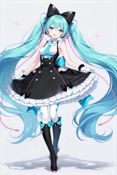 masterpiece,best quality,newest,absurdres,highres,soft shadows,photorealistic,(bison cangshu:0.5),(hiten \(hitenkei\):0.4),(rimuu:0.5),(mignon:0.5),(sheya:0.6),<lora:MMM2016XLNAI:1>,magical mirai miku \(2016\),black bow,hair bow,sleeveless dress,frilled dress,black dress,layered dress,pocket,framed breasts,white thighhighs,high heel boots,knee boots,full body,