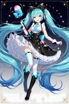 masterpiece,best quality,newest,absurdres,highres,soft shadows,photorealistic,(bison cangshu:0.5),(fuzichoco:0.6),(rimuu:0.5),(mignon:0.5),(sheya:0.6),<lora:MMM2016XLNAI:1>,magical mirai miku \(2016\),black bow,hair bow,sleeveless dress,frilled dress,black dress,layered dress,pocket,framed breasts,white thighhighs,high heel boots,knee boots,holding,full body,