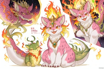 The image is a colorful illustration featuring a cute, fiery-themed character named "火龙果猫" (Hólóng gǔ mā). The character is depicted with a red and yellow flame-like mane, resembling a dragonfruit, and has a friendly, smiling expression. It is sitting on the ground, surrounded by various elements.