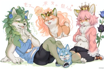 The image features a character holding a large pink rose-like object with a cute, fluffy appearance. The character is wearing a blue shirt and black shorts, with orange shoes. There are also two smaller versions of the same object, one being held by the character and the other lying on the ground. The background is filled with pink roses, and there is Japanese text describing the character and the object. The text includes phrases like "Flower Fairy Pink Rose Shiba Inu" and "お花のフリーフリーパチャロンガール," which translates to "Flower Fairy Pink Rose Shiba Inu Flower Fairy." Additionally, there is a small illustration of a green lion-like creature with a crown, and a note mentioning that the character is a "ファンタグランド" (Fandom).Vegetable Fairy,furry