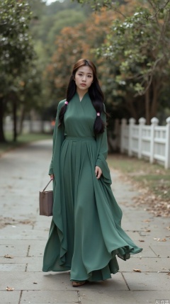 The image shows a young woman wearing a long, flowing green dress with a high neckline and long sleeves. She is standing on a stone pathway with trees and a white fence in the background. The woman has long black hair styled in a half-up, half-down hairstyle with a flower in her hair. She has a serious expression on her face and is holding a brown bag in her left hand. The dress is flowing and cascades down her back, creating a flowy silhouette. The overall mood of the image is elegant and graceful.
