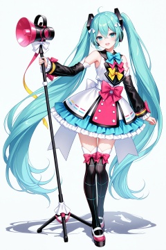 masterpiece,best quality,newest,absurdres,highres,soft shadows,photorealistic,(chen bin:0.5),(hiten \(hitenkei\):0.4),(rimuu:0.5),(mignon:0.5),(sheya:0.6),<lora:MMM2018XLNAI:1>,magical mirai miku \(2018\),black sleeves,ribbon,bowtie,headphones,uwabaki,hair ornament,detached sleeves,multicolored dress,frilled dress,blue bow,bow legwear,platform footwear,standing,full body,holding,