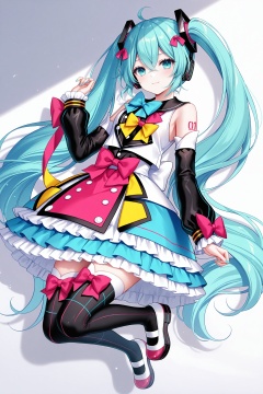 masterpiece,best quality,newest,absurdres,highres,soft shadows,photorealistic,(chen bin:0.5),(hiten \(hitenkei\):0.4),(rimuu:0.5),(mignon:0.5),(sheya:0.6),<lora:MMM2018XLNAI:1>,magical mirai miku \(2018\), black sleeves, ribbon, bowtie, headphones, uwabaki, hair ornament, detached sleeves, multicolored dress, frilled dress, blue bow, bow legwear, platform footwearfull body,
