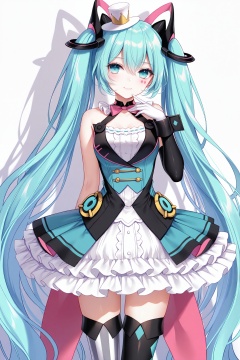 masterpiece,best quality,newest,absurdres,highres,soft shadows,photorealistic,(chen bin:0.5),(hiten \(hitenkei\):0.4),(rimuu:0.5),(mignon:0.5),(sheya:0.6),<lora:MMMiku2019XLNAI:1>,1girl,magical mirai miku \(2019\),frilled_dress,frills,mismatched legwear, white thighhighs, black thighhighs,