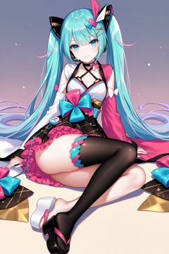 masterpiece,best quality,newest,absurdres,highres,soft shadows,photorealistic,(bison cangshu:0.5),(fuzichoco:0.6),(rimuu:0.5),(mignon:0.5),(sheya:0.6),<lora:MMM2020summerXLNAI:1>,magical mirai miku \(2020 summer\),sandals,multicolored hair,hair ornament,japanese clothes,wide sleeves,hand fan,mismatched sleeves,white sleeves,pink sleeves,frilled skirt,black thighhigh,single thighhigh,bare leg,platform footwear,mismatched footwear,white footwear,black footwear,full body,yokozuwari,thick thighs,