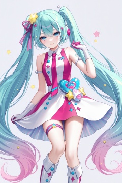 masterpiece,best quality,newest,absurdres,highres,soft shadows,photorealistic,(chen bin:0.5),(hiten \(hitenkei\):0.4),(rimuu:0.5),(mignon:0.5),(sheya:0.6),<lora:MMM2022XLNAI:1>,magical mirai miku \(2022\),necktie,multicolored hair,hair ornaments,multicolored dress,white dress,pink dress,knee boots,thigh strap,multicolored gloves,ribbon,