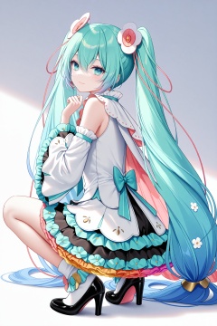 masterpiece,best quality,newest,absurdres,highres,soft shadows,photorealistic,(chen bin:0.5),(hiten \(hitenkei\):0.4),(rimuu:0.5),(mignon:0.5),(sheya:0.6),<lora:MMM2021XLNAI:1>,magical mirai miku \(2021\),white clothes,cape,wide sleeves,frilled skirt,black skirt,hair ornaments,detached sleeves,frilled sleeves,high heels,full body,