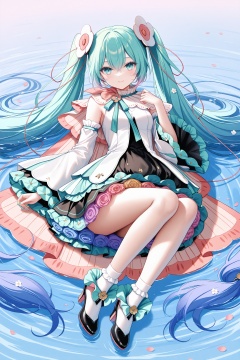masterpiece,best quality,newest,absurdres,highres,soft shadows,photorealistic,(chen bin:0.5),(hiten \(hitenkei\):0.4),(rimuu:0.5),(mignon:0.5),(sheya:0.6),<lora:MMM2021XLNAI:1>,magical mirai miku \(2021\),white clothes,cape,wide sleeves,frilled skirt,black skirt,hair ornaments,detached sleeves,frilled sleeves,high heels,on water,floating_on_water,