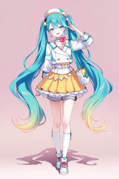 masterpiece,best quality,newest,absurdres,highres,soft shadows,photorealistic,(chen bin:0.5),(hiten \(hitenkei\):0.4),(rimuu:0.5),(mignon:0.5),(sheya:0.6),<lora:MMM2024XLNAI:1>,magical mirai miku \(2024\),shorts,sneakers,headwear,white shirt,yellow skirt,frilled skirt,white kneehighs,