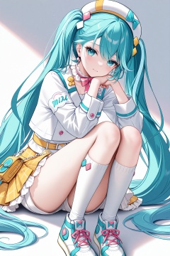 masterpiece,best quality,newest,absurdres,highres,soft shadows,photorealistic,(chen bin:0.5),(hiten \(hitenkei\):0.4),(rimuu:0.5),(mignon:0.5),(sheya:0.6),<lora:MMM2024XLNAI:1>,magical mirai miku \(2024\),shorts,sneakers,headwear,white shirt,yellow skirt,frilled skirt,white kneehighs,tears_in_eyes,
