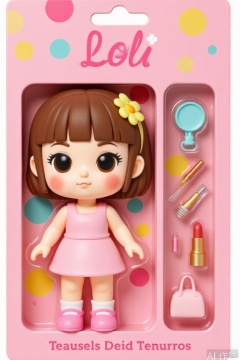 F1Gpt4OShouB, The image shows a cute, chibi-style doll in a pink packaging. The doll has large, round eyes, a small nose, and a rosy cheeks. She has short brown hair with a yellow flower accessory in her hair. She is wearing a sleeveless pink dress and pink shoes. To the right of the doll, there are three small accessories: a compact mirror, a lipstick, and a small handbag. The background is pink with colorful abstract shapes. The text at the bottom reads "Fiorral Loli Teausels Deid Tenurros, " which is in Spanish. The packaging is designed to resemble a playful and colorful gift or collectible.