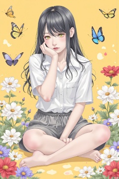 shadow,masterpiece,extremely delicate and beautiful,best quality,artistic style,fashionable,cool and fashionable,masterpiece,best quality,good quality,very aesthetic,A shot with tension,impactful picture,offcial art,colorful,splash of color,movie perspective,masterpiece,facing the lens,best quality,very aesthetic,extremely delicate and beautiful,huge filesize,amazing quality,32K UHD 1girl, solo, long hair, looking at viewer, bangs, shirt, black hair, hair between eyes, sitting, closed mouth, yellow eyes, white shirt, flower, short sleeves, shorts, bug, plant, white flower, red flower, butterfly, yellow background, pink flower, gym uniform, blue flower, head rest, yellow flower, purple flower, blue butterfly, yellow butterfly