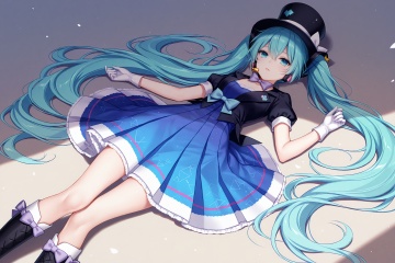 masterpiece,best quality,newest,absurdres,highres,soft shadows,photorealistic,(bison cangshu:0.5),(hiten \(hitenkei\):0.4),(rimuu:0.5),(mignon:0.5),(sheya:0.6),<lora:MMM2013XLNAI:1>,magical mirai miku \(2013\),top hat,gloves,puffy sleeve,black shirt,blue dress,knee boots,standing,on back,bowtie,