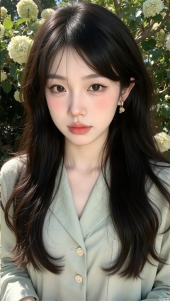 1girl, solo, long hair, looking at viewer, shirt, black hair, brown eyes, jewelry, flower, earrings, outdoors, parted lips, black eyes, tree, lips, portrait, realistic