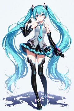 masterpiece,best quality,newest,absurdres,highres,soft shadows,photorealistic,(bison cangshu:0.5),(hiten \(hitenkei\):0.4),(rimuu:0.5),(mignon:0.5),(sheya:0.6),<lora:MMM2014XLNAI:1>,magical mirai miku \(2014\),hair ornament,necktie,detached sleeve,sleeveless shirt,thigh boots,full body,