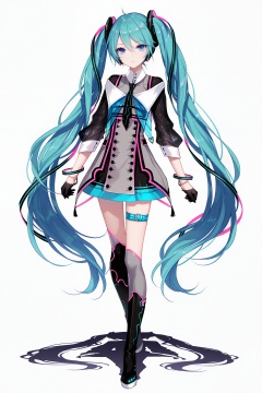 masterpiece,best quality,newest,absurdres,highres,soft shadows,photorealistic,(bison cangshu:0.5),(fuzichoco:0.6),(rimuu:0.5),(mignon:0.5),(sheya:0.6),<lora:mmiku:1>,magical mirai miku \(2015\),skirt,jacket,boots,bracelet,hair ornaments,hair ribbon,thigh strap,half gloves,full body,