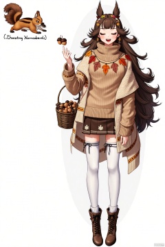 GFLH, a female character with long, curly brown hair, wearing a cozy, knitted sweater and skirt in earthy tones, adorned with autumn leaf patterns. She has squirrel ears and a warm smile, holding a basket of acorns in one hand and looking content. The simple white background accentuates her cozy, autumnal charm.