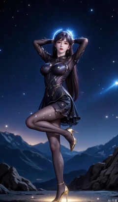 The individual is wearing a black, lace dress with star patterns and sheer stockings