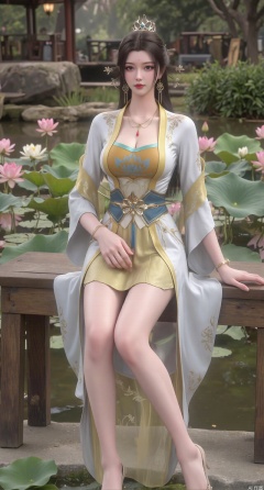 SFW,(masterpiece:1.2),best quality,The image is a digital illustration of a young woman sitting on a wooden bench in a pond with lily pads. She is wearing a long dress with design on the chest and sleeves. The dress has a high neckline and short sleeves,Holding a lotus in hand. She has long dark hair styled in loose waves and is wearing gold high heels. The woman is posing with one hand on her hip and the other resting on the edge of the bench. The background is filled with pink and white lotus flowers and green leaves. The overall mood of the image is peaceful and serene,(huge breasts:2.99),(full breasts:2.99),(Background with traditional Chinese architecture, lotus pond and pink lotus flowers:1.39),XtianqiongY,XliumeiY,XyueliuY,Xxiaowu,Xyusanniang,Xxuenv,XchuxuanerXY,XchuxuanerX,Xhuangnv,XyunyunX,XqingnvzongZM