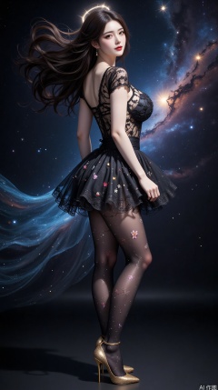 Against a backdrop of flowing nebulae, a graceful woman stands elegantly at the center of the scene. Her hair glows like a galaxy, adorned with tiny starlight accents, as if merging with the universe. She wears a dreamy floral dress with a black lace mesh design, adorned with delicate nebula-inspired floral patterns, subtly accentuating her perfect curves. Beneath the short skirt, she wears black stockings with a shimmering surface, featuring intricate nebula-like jacquard patterns, resembling constellations in the night sky. Her feet are adorned with golden high heels, their slender stiletto heels resembling beams of light in the interstellar expanse, adding an aura of elegance and mystique to her ensemble.