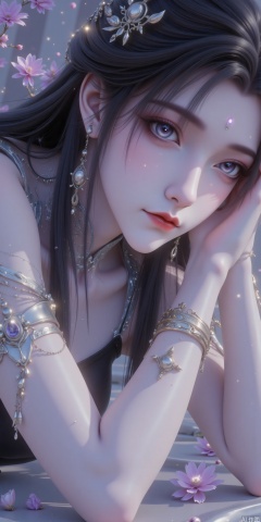 This image is a CGI rendered digital artwork depicting a young woman with a pale, ethereal appearance lying on her face in a low, dramatic position. She has long, flowing black hair, hanging from her shoulders, and brown eyes, giving a quiet, almost meditative look. Her skin is smooth and fair, slightly translucent, suggesting a supernatural or other worldly qualities. She wore a black sleeveless top with beautiful patterns and a high neckline and a golden arm ring on her left arm. On her left forearm is a mysterious symbol similar to a star or a five-pointed star, emitting a faint purple light.