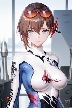 1girl, solo, bridget,breasts, looking at viewer, short hair, blue eyes, brown hair, medium breasts, bodysuit, eyewear on head,upper body,