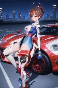 1girl, solo, bridget,breasts, looking at viewer, short hair, blue eyes, brown hair, medium breasts, bodysuit,eyewear on head,smile,headgear, ground vehicle, motor vehicle, car, sports car, on vehicle, canonicals, cityscape, downtown, night_sky,high heels,
