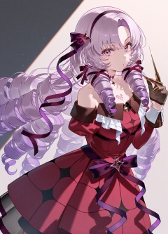 20,hyakumantenbara salome,virtual youtuber,long hair,red dress,1girl,dress,claw ring,drill hair,gloves,purple eyes,holding,solo,black gloves,purple hair,looking at viewer,puffy sleeves,bare shoulders,long sleeves,ribbon,off-shoulder dress,hair ribbon,parted bangs,purple ribbon,juliet sleeves,off shoulder,very long hair,red sleeves,chest tattoo,detached sleeves,hairband,