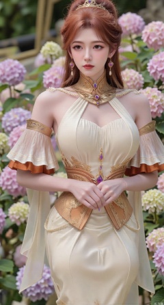 SFW,(masterpiece:1.2),best quality,absurdres,masterpiece,original,extremely detailed wallpaper,perfect lighting,1girl,solo,looking at viewer,(cowboy_shot:1.3),long hair,high heels,blurry background,depth of field,motion blur,(long dress:1.23),china_dress,chinese_style,bare shouders,crystal_earrings,headpiece,hair_tie,chest_jewel,gem,necklace,jewelry,in summer,day,outdoors,nature,garden,,(standing,Hydrangea, Hydrangea Field:1.59),(huge breasts:2.99),(full breasts:2.99),Xzhihua,Xsiyouyou,Xyanruyu,Xmoxiaonan,Xyeqingxian,Xyunwangshu,XlishaoyinY,Xxiaowu,Xyusanniang,XhuolingerHHY,Xwangqiuer,Xxuenv,XyunyunX,XqingnvzongZM,Xjuzi