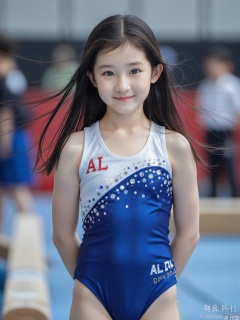 A young woman with long black hair, striking blue eyes, and distinct mixed race facial features is wearing a tight blue and white dress that tightly wraps around her plump body, adorned with shiny decorative details. Her breasts are particularly full, and her gymnastics uniform reads' Al Girls' High School '. She stood in the gymnastics hall, with a balance beam visible in the foreground, and other people in the background were slightly unclear. Aperture of f/2.8 is used for shallow depth of field to highlight the subject, shutter speed of 1/250s is used for capturing moments, ISO 400 is used for optimal indoor lighting balance, 85mm focal length is used for ideal portrait perspective, and a fixed focus lens is used for sharpness. In aperture priority mode, automatic white balance is used to adapt to indoor lighting, with a single point focusing on the subject's face