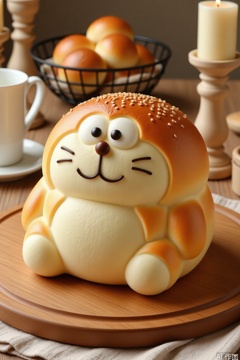 A photo showing a cute bread shaped like a Doraemon with a golden brown and white texture on a wooden board. Bread with black sesame eyes and a smile. There is a white cup, a basket of buns and a beige candlestick in the background. The whole scene is warm and comfortable.