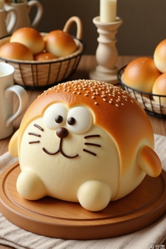 A photo showing a cute bread shaped like a Doraemon with a golden brown and white texture on a wooden board. Bread with black sesame eyes and a smile. There is a white cup, a basket of buns and a beige candlestick in the background. The whole scene is warm and comfortable.